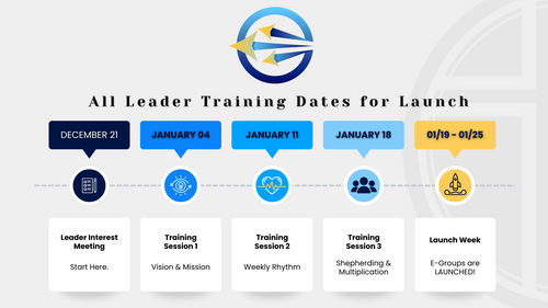 E-Groups follow a simple, intentional rhythm designed to disciple deeply, cultivate real spiritual growth, and multiply leaders every year.