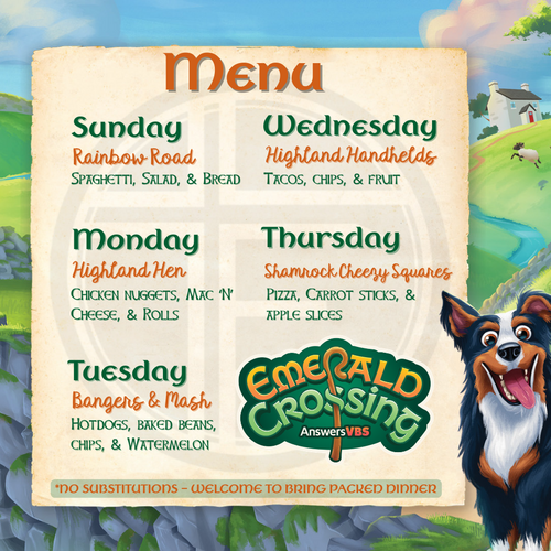 Our Dining Policy: To keep our kitchen running smoothly, we are unable to provide menu substitutions. If your child has specific dietary needs or preferences, parents are more than welcome to send them with a packed dinner each evening.